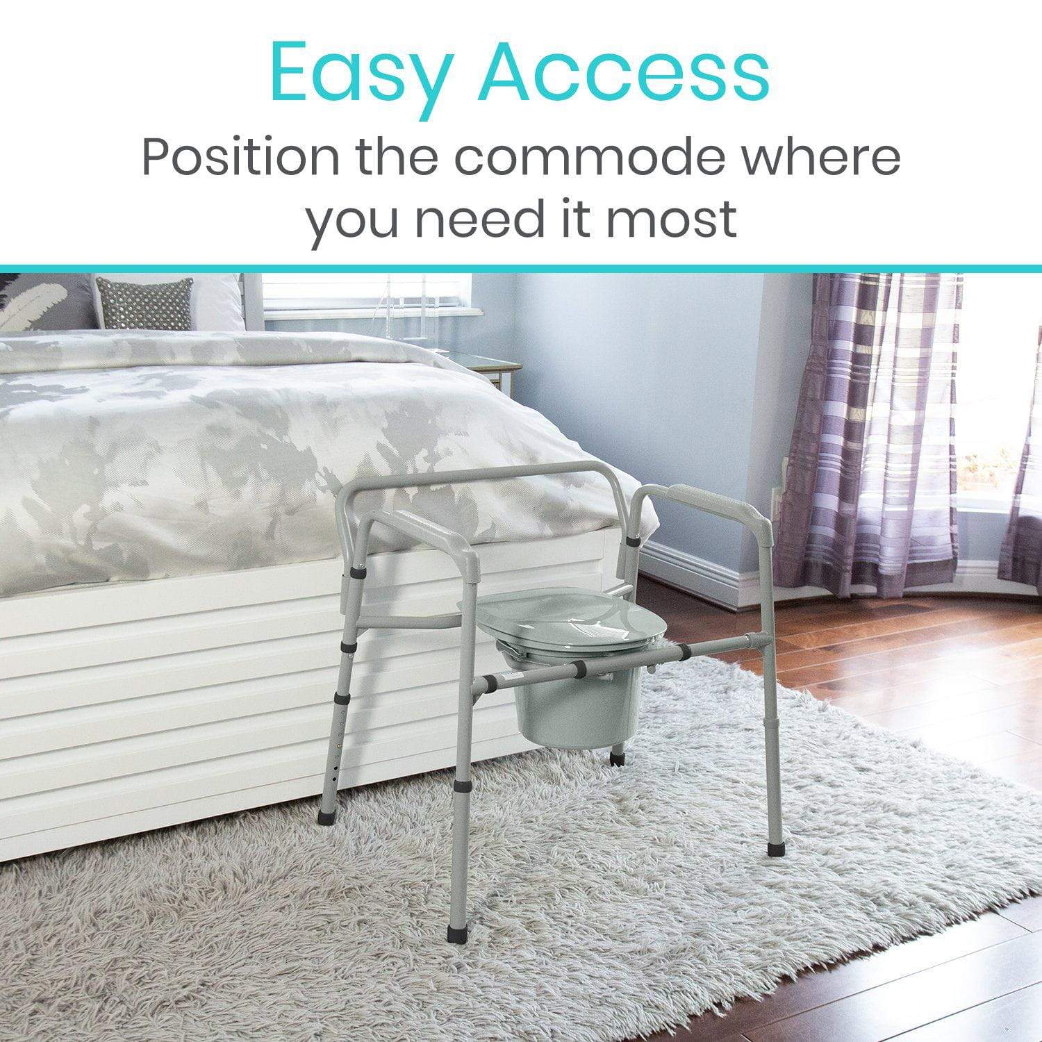 Initial setup is quick and easy, simply insert the legs to the desired height, set the pail in the frame and place the commode in the desired location