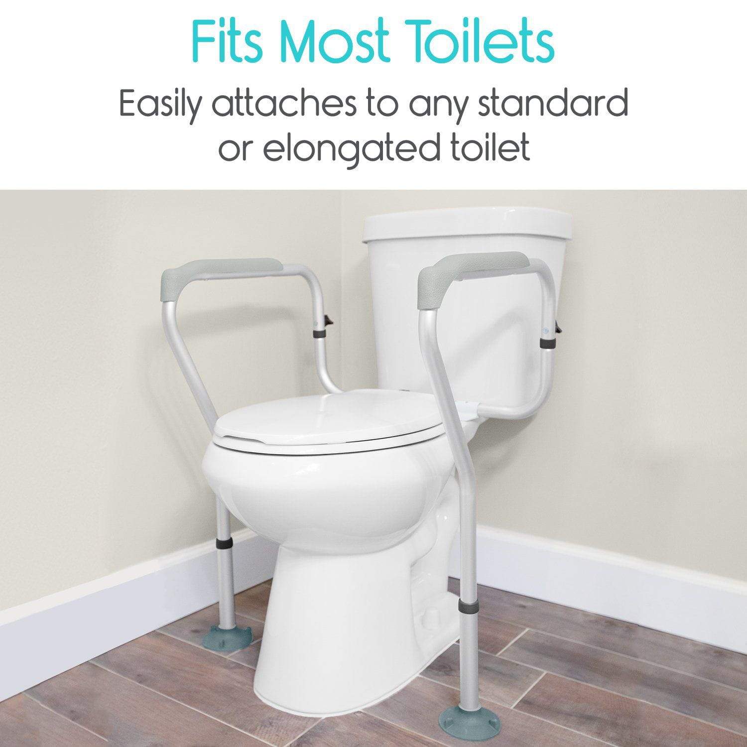 Adjustable safety rail fits all standard, elongated and irregular toilets